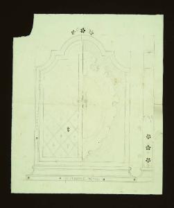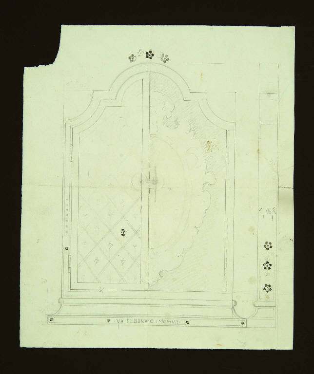 sul disegno a matita si trovano sparsi alcuni elementi decorativi floreali ottenuti probabilmente con stampini; al verso, altri schizzi a matita e decorazioni a stampa