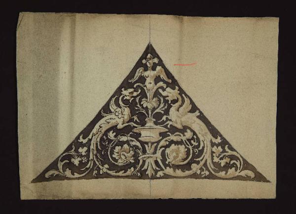 sulla base tracciata a matita, il colore è steso all'acquerello bruno in diverse tonalità; asse di simmetria della composizione tracciato a matita;la parte sinistra è arricchita di contorni con inchiostro più scuro; segno arancione in alto verso destra; al verso, contorno e asse di simmetria tracciati a matita, e figura di putto; carta grezza verdastra