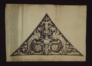 - NOTIZIE STORICO CRITICHE Il gruppo di fogli di cui questo fa parte sembra costituire il modello per la decorazione a grottesche degli spicchi di un soffitto a crociera a più campate. Una realizzazione simile (ma che non corrisponde ai disegni qui schedati) è quella visibile oggi nell'atrio del palazzo su via Santo Spirito. Il putto abbozzato al verso del foglio qui schedato è da collegare a quelli raffigurati all'Inv. 264/85.