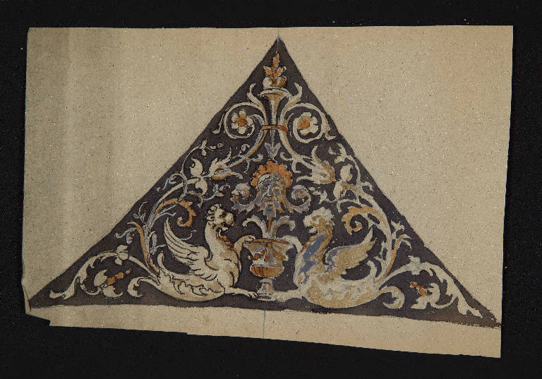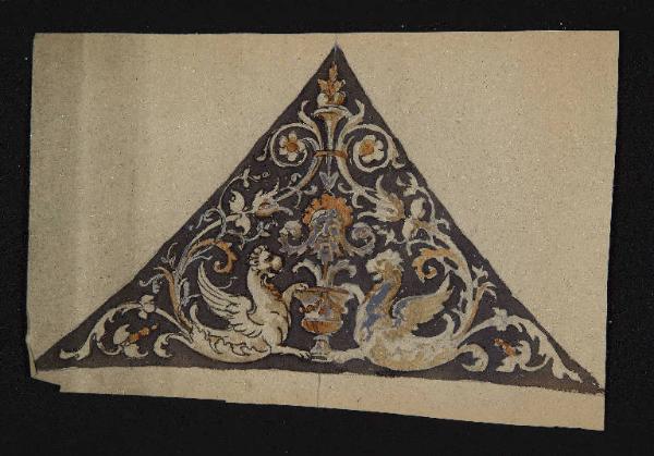 - NOTIZIE STORICO CRITICHE Il gruppo di fogli di cui questo fa parte sembra costituire il modello per la decorazione a grottesche degli spicchi di un soffitto a crociera a più campate. Una realizzazione simile (ma che non corrisponde ai disegni qui schedati) è quella visibile oggi nell'atrio del palazzo su via Santo Spirito.