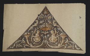 - NOTIZIE STORICO CRITICHE Il gruppo di fogli di cui questo fa parte sembra costituire il modello per la decorazione a grottesche degli spicchi di un soffitto a crociera a più campate. Una realizzazione simile (ma che non corrisponde ai disegni qui schedati) è quella visibile oggi nell'atrio del palazzo su via Santo Spirito.