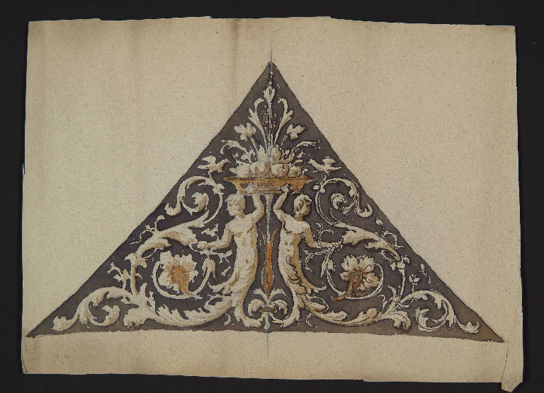 - NOTIZIE STORICO CRITICHE Il gruppo di fogli di cui questo fa parte sembra costituire il modello per la decorazione a grottesche degli spicchi di un soffitto a crociera a più campate. Una realizzazione simile (ma che non corrisponde ai disegni qui schedati) è quella visibile oggi nell'atrio del palazzo su via Santo Spirito.