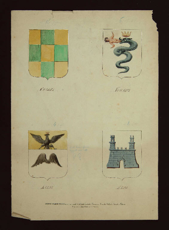 - NOTIZIE STORICO CRITICHE Il foglio presenta gli stemmi delle famiglie Cusani, Visconti, Arese, Erba.