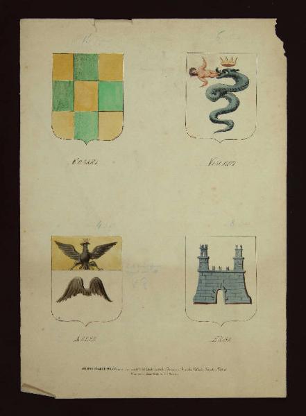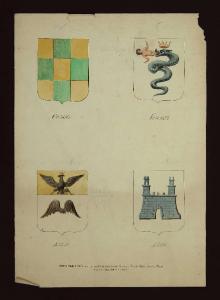 acquerellatura di vari colori: verde, giallo, rosa, grigio, nero, blu; quattro stemmi disposti simmetricamente nel foglio, ciascuno stemma numerato e con il nome della famiglia scritto a penna su riga a matita