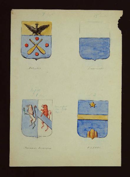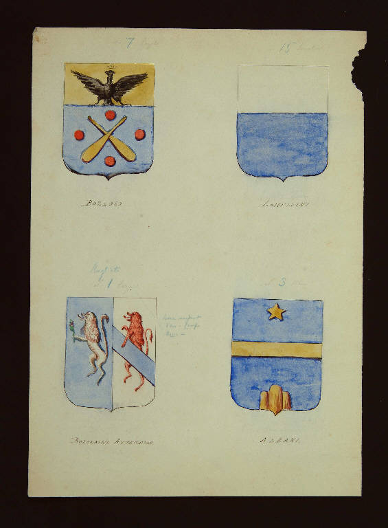 acquerellatura di vari colori: rosso, giallo, rosa, marrone, grigio, nero, blu; quattro stemmi disposti simmetricamente nel foglio, ciascuno stemma numerato e con il nome della famiglia scritto a penna su riga a matita