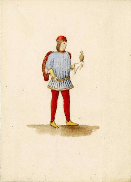 Soggetto colorato con acquerelli di colore rosso, blu in due tonalità, rosa, giallo, marrone. Sul restro schizzi a matita per abiti.