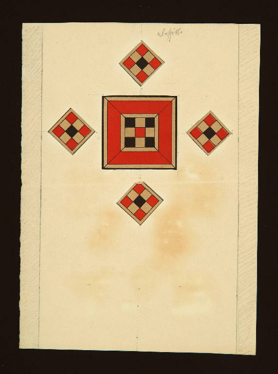 Elementi decorativi a quadrati incollati in una composizione, cornice a matita che evidenzia i margini laterali del foglio.