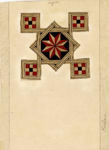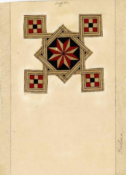Elementi decorativi a quadrati incollati in una composizione, cornice a matita che evidenzia i margini laterali del foglio.