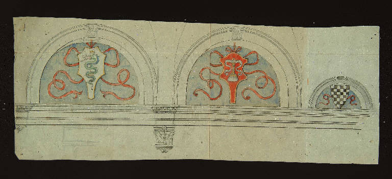 decorazione di due archivolti riproducente lo stemma con il biscione e un altro stemma con cartiglio su scritto