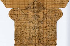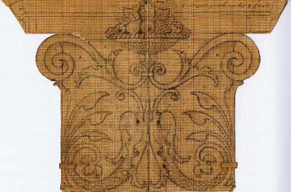 capitello con decorazione di due delfini simmetrici le cui teste combaciano sorreggono dei girali vegetali e un vassoio di frutta in alto a centro