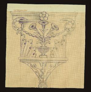 capitello raffigurante tra due grandi foglie d'acanto un vaso da cui fuoriescono tre fiori davanti al quale c'è una collana di perle ovali sorretta da due riccioli paralleli di elementi vegetali\nnel piedritto una conchiglia sulla quale si erge un tridente e ai cui lati ci sono due delfini