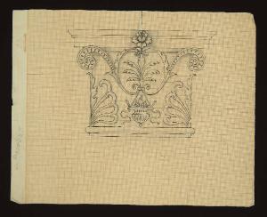 capitello con decorazione fitomorfa, tra due grandi foglie d'acanto nel centro è raffigurato un bracere decorato dal quale spunta una fiamma e due nastri paralleli che cadono ondulati verso il basso\nsul bordo sinistro del foglio c'è una scritta "Dottori"\nnel verso: alcune macchie di umidità