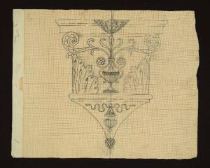capitello con decorazione floreale: tra due grandi e parallele foglie d'acanto è raffigurato nella parte centrale un vaso da cui si dipartono parallele e simmetriche delle foglie e due racemi d'acanto sormontati al centro da un testa di fanciullo alata. Nel piedritto è raffigurato una "conchiglia" che regge un bracere con una fiamma da cui fuoriescono due nastri ondulati