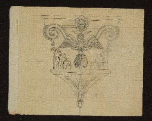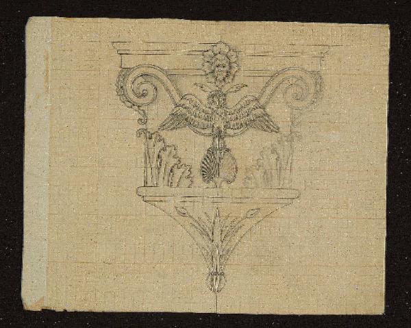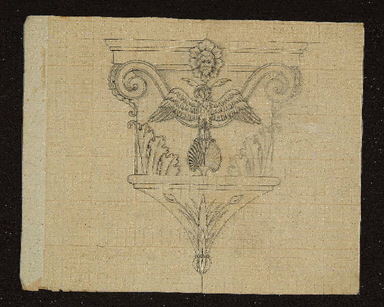 capitello con decorazione: tra due grandi e simmetriche foglie d'acanto al centro è raffigurata un'aquila dalle ali spiegate su di una conchiglia, nel piedritto una decorazione floreale simmatrica \nnel verso: disegno di una serliana