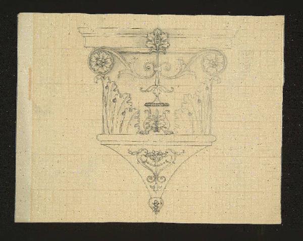 capitello con decorazione fitomorfa: tra due grandi e simmetriche foglie d'acanto nella parte centrale del foglio è raffigurato un "basamento" decorato sul quale poggia un fiore dal cui stelo al cui stelo si dipartono due racemi d'acanto simmetrici nelle cui volute è posto un fiore