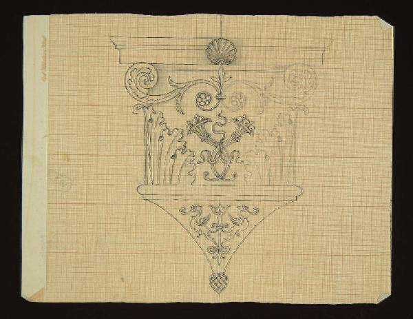 capitello con decorazione fitomorfa: nella parte centrale, tra due grandi e simmetriche foglie d'acanto, sono raffigurate due cornucopie incrociate da cui partono tre nastri ondulati e nella parte alta due girali di foglie d'acanto. Nel piedritto ai lati di uno stelo di un due animali alati fantastici simmetrici. E' disegnato un fiore sul lato sinistro a metà del foglio\nnel verso: un disegno di tre archi a sesto acuto,