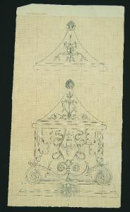 capitello con decorazione fitomorfa stemma con giglio al centro nastri incurvati al centro due delfini simmetrici\nnel piedritto un tridente\nnel verso il ricalco del disegno sul recto(cartone)