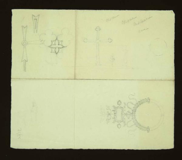 schizzi raffiguranti una croce, una corona tonda per metà coperta di foglie alla quale sono legati dei nastri ondulati ed un cartiglio rettangolare, una figura di uomo con saio, una croce mancante di un braccio ed una decorazione a fiori \nnel verso: in un tondo lo schizzo di un'aquila con le ali spiegate che poggia gli artigli sopra un nastro ondulato