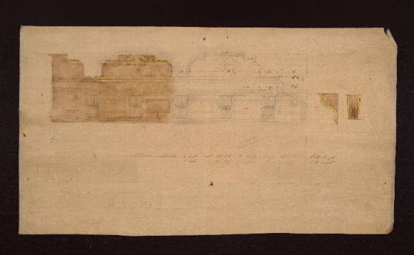trabeazione caratterizzata da un architrave con mensole e riquadri rettangolari e un fregio semplice interrotto da modanature (una scritta e misure)\nnel verso: una scritta