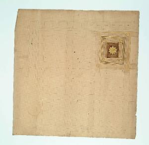 riquadri rettangolari uno dei quali decorato con un fiore giallo oro su fondo marrone inquadrato in una cornice (schizzo di una decorazione per parete o pavimento)\nmisure e calcoli