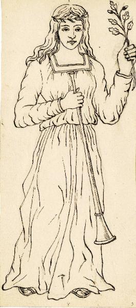 Donna dai capelli lunghi e sciolti sulle spalle ha sulla fronte una sottile corona di foglie. Indossa tunica con scollo quadrato e calzari. Tiene con la mano sinistra chiusa a pugno e sollevata un ramoscello di quercia con foglie e ghiande e con la mano destra, poggiata al petto, una tromba rivolta verso il basso\nnel verso: schizzi di rettangoli, una mano chiusa a pugno che stringe un ramoscello