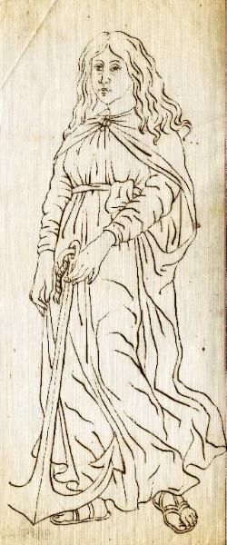 una donna dai capelli lunghi che indossa una tunica, un manto, tenuto sulle spalle da una spilla, e dei calzari ed è raffigurata di tre quarti con la mano destra poggiata su di una grande ancora