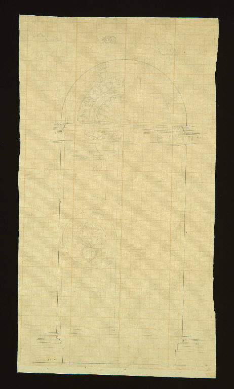 schizzo di un portale che presenta solo in parte la decorazione della trabeazione e del timpano\nAl centro del foglio un battente con testa di leone