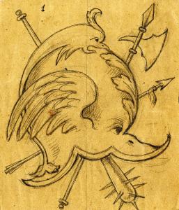 un elmo a forma di testa di delfino alato, decorato da una foglia d'acanto sulla fronte e un delfino con coda a foglia sulla calotta, raffigurato di profilo\ndavanti ad un incrocio di una freccia , un bastone con aculei e un' alabarda