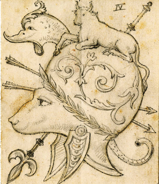 un elmo a forma di testa di animale, decorato con una corona di foglie che circonda la fronte e dei girali e un toro accovacciato sulla calotta e una testa di delfino sulla fronte, raffigurato davanti ad un intreccio di due frecce e una lancia