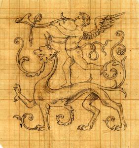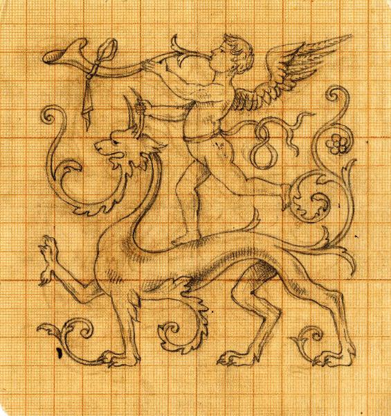 una chimera, dalla coda a forma di girali, porta sul dorso un bambino nudo, alato,in piedi con la gamba destra sollevata, che suona una tromba sorretta con la mano destra mentre con la sinistra si regge alle corna dell'animale \nnel verso: schizzo di uno scudo