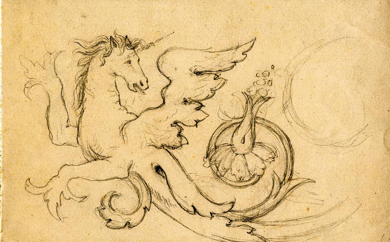 un unicorno alato con zampe di drago e coda a voluta che termina con un elemento vegetale (fiore)\n\nnel verso: schizzi di una testa di cavallo bardata da finimenti preziosi; di una cornice ovale con ricci; di una fascia con decorazione florele