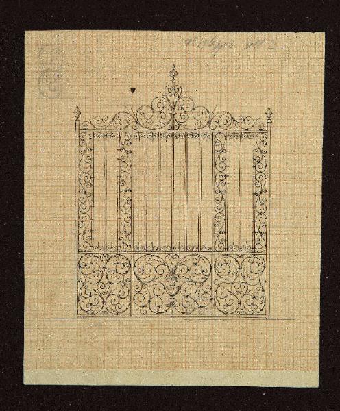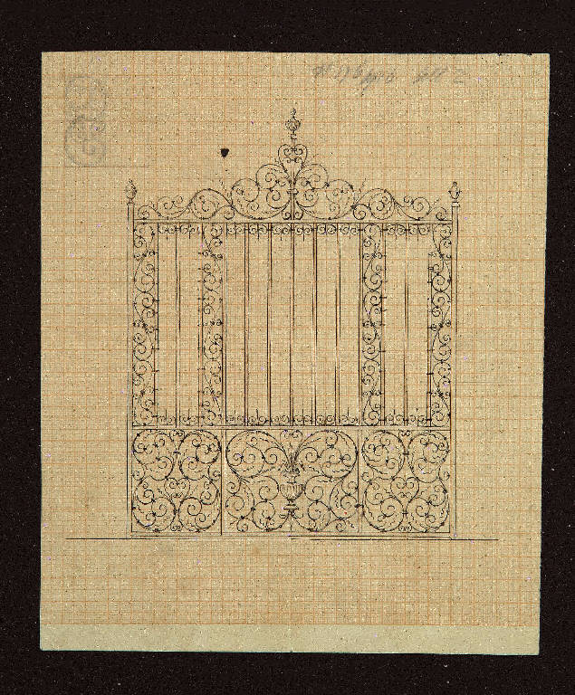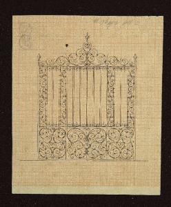 Cancello decorato con girali vegetali ricurvi che fuoriescono da un vaso centrale . \nUn piccolo schizzo sull'angolo in alto a sinistra di girali vegetali