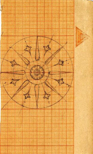 tondo decorato al centro da un fiore da cui a raggiera si dipartono piccoli gigli e petali stilizzati