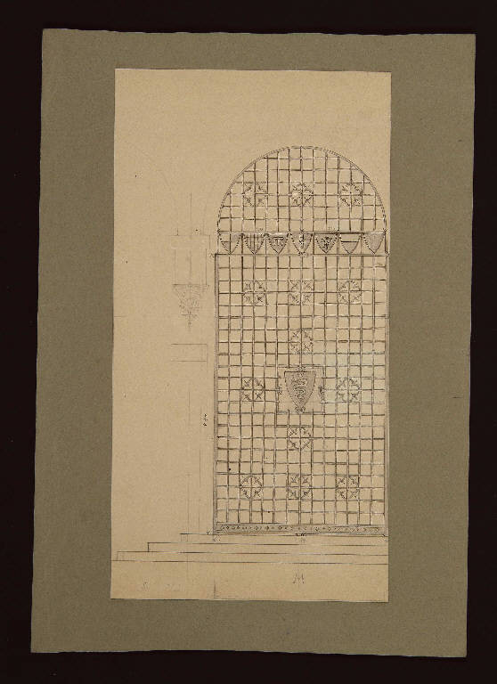 cancello di un portale posto su tre gradini che presenta lo stemma degli Sforza nel suo centro, altri piccoli stemmi lungo la fascia orizzontale della lunetta e altre forme polilobate
