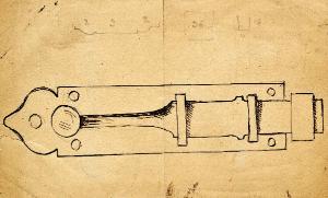 un chiavistello e dei numeri in corrispondenza di alcune parti dell'oggetto\nnel verso: tre schizzi di oggetti riferibili ad una porta
