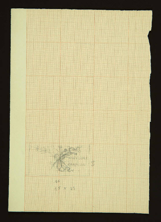 schizzo di piccole dimensioni in basso a sinistra raffigurante un mazzo di fiori tenuto insieme da nastri.\ndei numeri 46 e 45 x 23 e una scritta\n\nnel verso: tre fiori tenuti insieme da un nodo a fiocco di un nastro ondulato