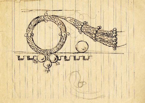 una ghirlanda circolare di foglie e pomi a cui è collegata una cornucopia fogliata, parte di una cornice dentellata