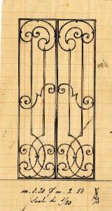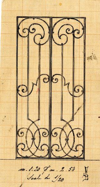 cancello in ferro battuto per porta rettangolare con decorazione a ricci \nscritta e firma