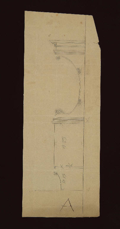 mensola raffigurata di profilo con decorazione floreale\nLettera A e le misure\n \nnel verso: schizzo di decorazione floreale in una griglia rettangolare