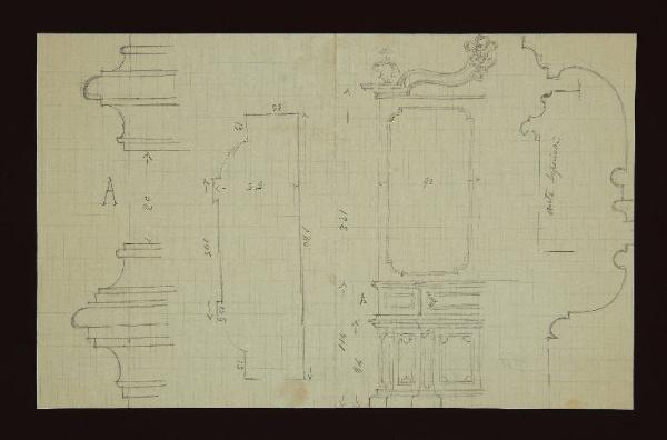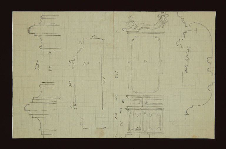 prospetto di un anta di un armadio in legno decorato con motivi vegetali e antropomorfi\nprofili di alcuni particolari deel mobile \nLettera A e riportate le misure