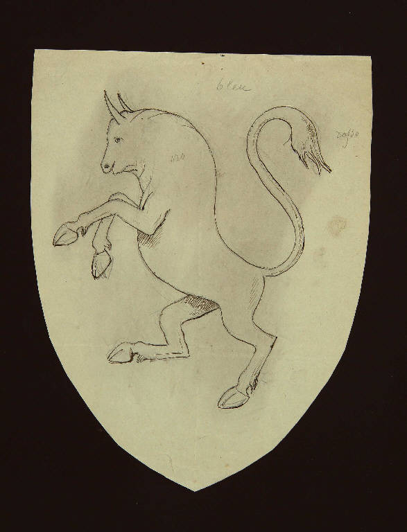 stemma a forma di scudo con un toro con gobba su due zampe e coda arcuata. E' indicato il colore per il toro (oro), e per il fondo (rosso e blu)\n\nNel verso la scritta Torino