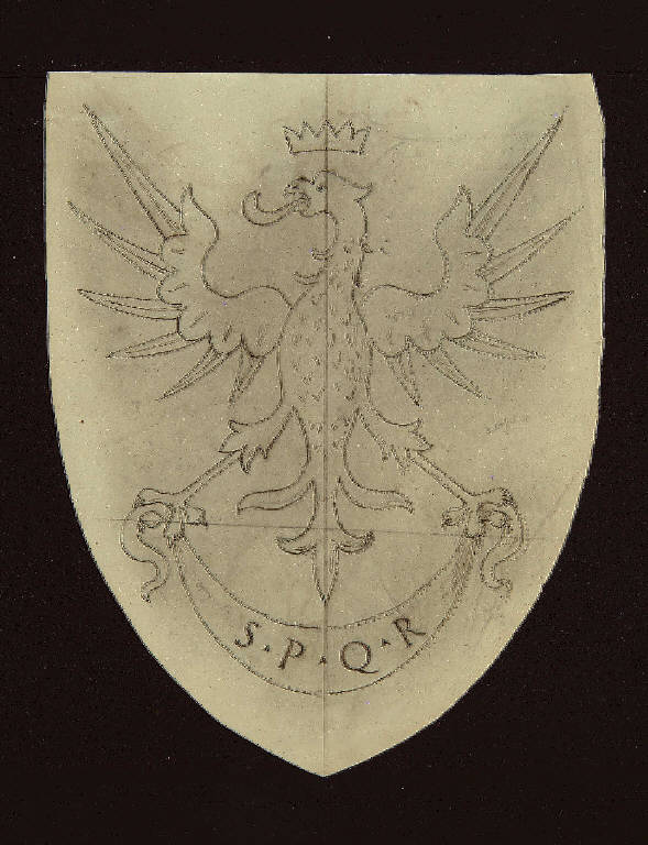 Aquila piumata in posizione frontale con le ali spiegate e la coda a forma di giglio; sulla testa di profilo una corona a cinque punte e con le zampe tiene un nastro con su scritto SPQR\nCi sono indicati i colori per il cartiglio (argento), per il fondo (rosso), per l'aquila (oro)\n\nNel verso la scritta Palermo