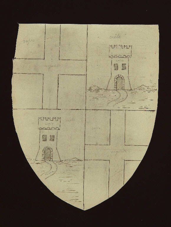 stemma diviso in quattro parti: quella destra in alto e sinistra in basso con due torri merlate con due finestre e un portale da cui parte un sentiero. Le altre due parti con delle croci\nDelle scritte indicanti i coloriper le torri (rosso), per il fondo (cielo), per le croci (argento) per il loro fondale (rosso) e per il sentiero (terra)\n\nNel verso :Cagliari
