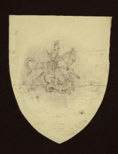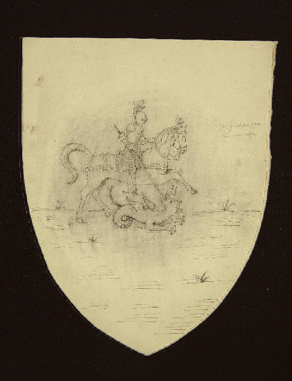cavaliere con armatura sul cavallo che con una lancia uccide trafiggendogli la bocca,un drago alato, accovacciato a terra\nScritte con le indicaioni dei colori per il terreno (terra), per il drago (verde), della (gualdrappa piume rosse)\n\nnel verso: Reggio Calabria