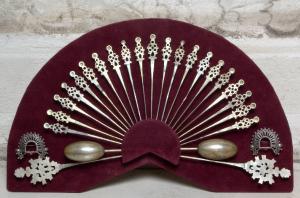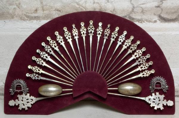 La raggera è composta 23 spadini corti, 2 spadini lunghi, uno spillone e 2 orecchini. Gli spadini corti assomigliano a piccole spade con elsa piatta, terminando i più piccoli con una decorazione a cerchietti sovrapposti e dischetti incavati, i maggiori con motivo a traforo. Lo spillone ha due palle ovali alle estremità. I due orecchini ripetono il motivo degli spadini più piccoli. Sono fissati su un cuscinetto in tessuto.