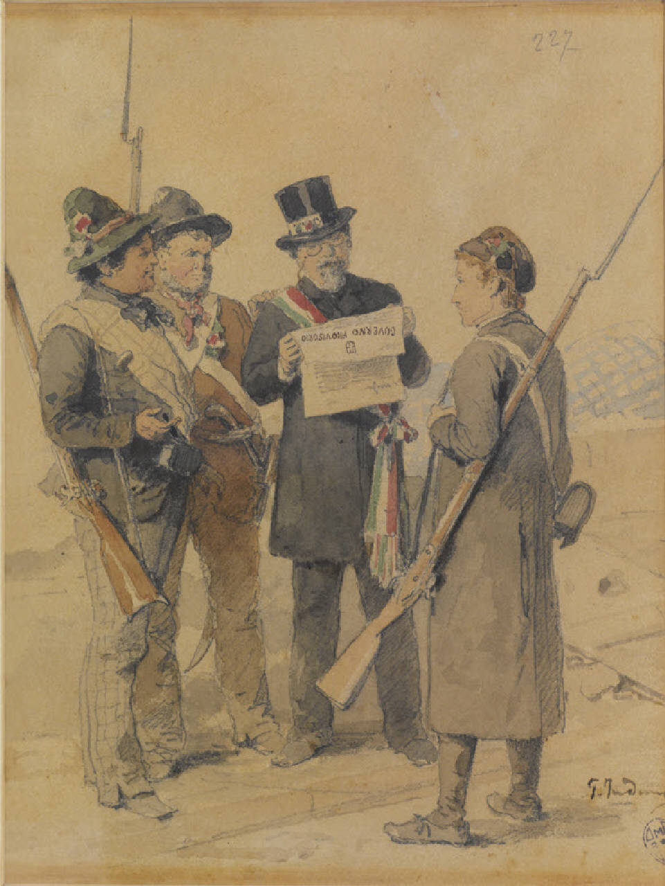 - NOTIZIE STORICO CRITICHE L'opera è stata donata dallo stesso autore, come da registro di ingresso, al n. 279, "Personaggio che legge un ordine del Governo provvisorio". Rispetto agli altri acquerelli del 1848, presenta una maggiore ricchezza dal punto di vista compositivo, trattando un soggetto narrativo; i personaggi vengono infatti ritratti attenti intorno a uno dei membri del Governo, descritto con una fascia tricolore, felice richiamo alla libertà. Gerolamo Induno appone la sua firma a questo foglio, unica presente su questi documenti, a testimonianza del valore dell'opera, considerata quindi definitiva nella sua esecuzione.\nL'esemplare reca al verso, in alto a destra, il cartiglio "Esposizione storica di Torino / 1884 / COMMISSIONE MILANESE / Espositore / Gerolamo Induno / N. 227".