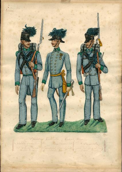 - NOTIZIE STORICO CRITICHE Sotto la parte figurata è indicato il periodo in cui questa divise di "Gran Tenuta" erano utilizzate: il soldato semplice indossa la Gran Tenuta impiegata dal 1840 al 1848, mentre il Capitano e il Caporale vestono quelle previste dal 1849 al 1859.
