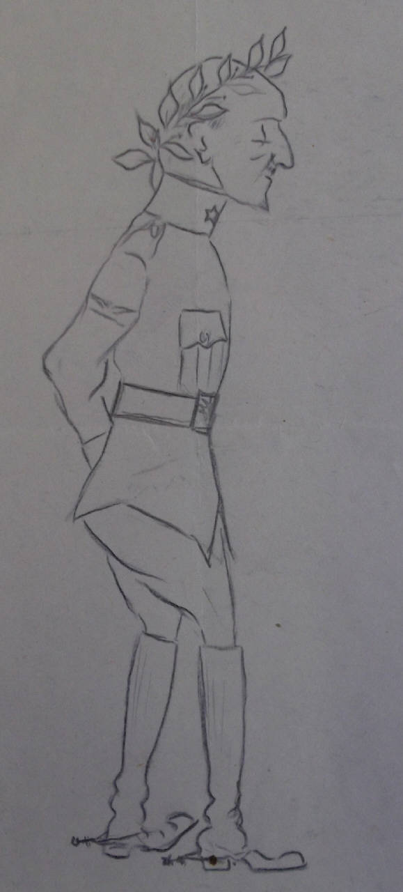 - NOTIZIE STORICO CRITICHE Gabriele D'Annunzio è raffigurato con indosso la divisa dei Lancieri di Novara 5, il braccio destro ferito e il fregio dei piloti dell'aviazione. Alla vita porta un cinturone modello14.\nNelle Civiche Raccolte Storiche è conservato anche il disegno (Cart. 495, pl. X.1).