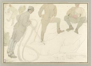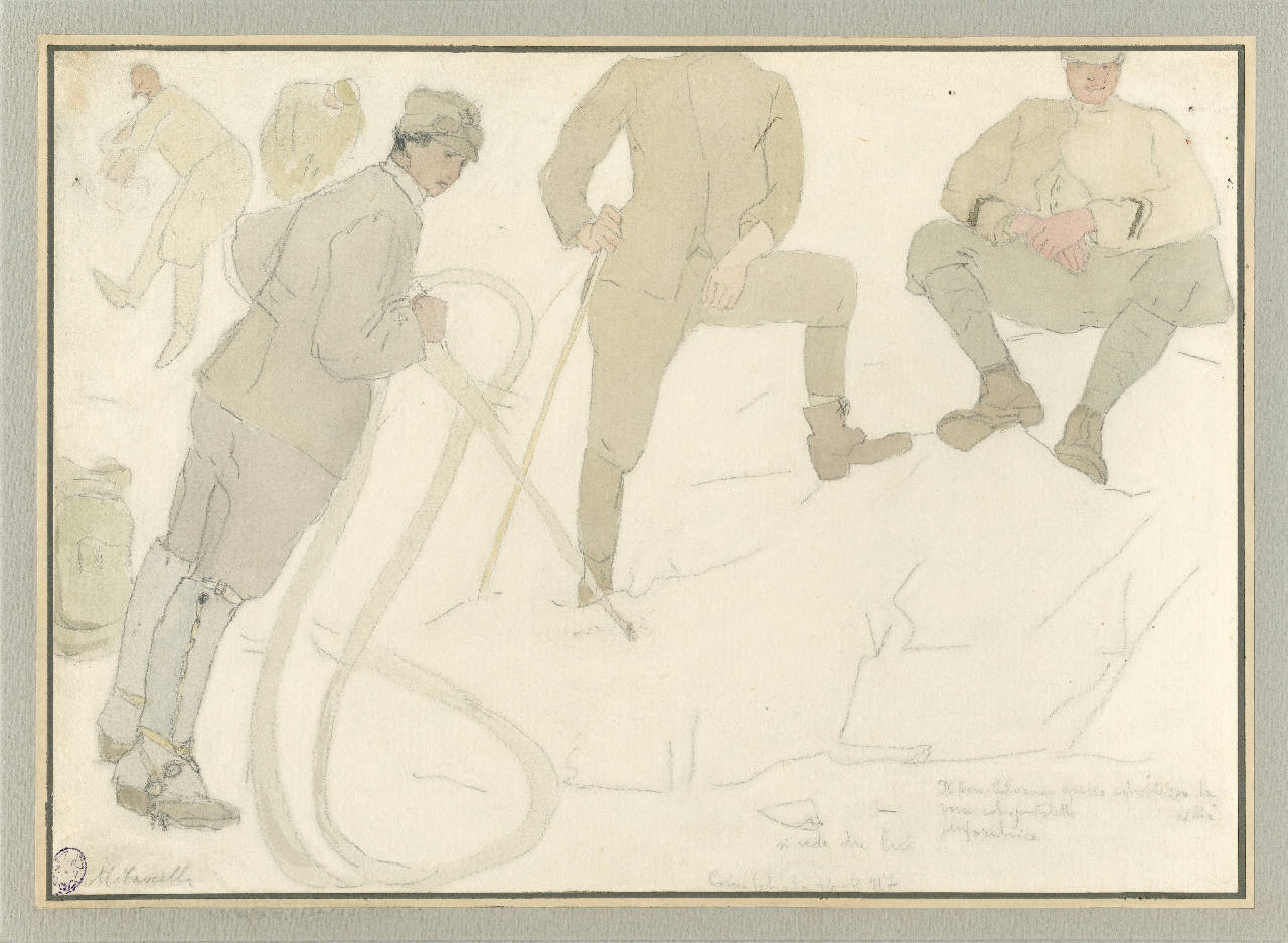 - NOTIZIE STORICO CRITICHE Sul disegno al verso al centro cartiglio con la dicitura "Esposizione di guerra degli artisti/ mutilati e combattenti/ Villa Reale di Monza/ 1924/ Numero d'ordine 17/ Nome e cognome dell'espositore/ recapito/ Titolo dell'opera: Perforatrice in azione (Zugna)/ Eventuale prezzo"
