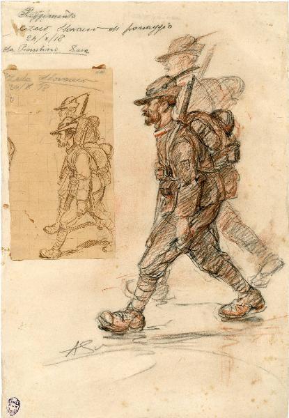 - NOTIZIE STORICO CRITICHE Il foglio presenta al reto un foglio incollato (mm. 154 x 85) che rappresenta invece due soldati serbo-slovacco eseguiti a china, si noti l'iscrizione "Czeco Slovacco / 24/X/18"; i soldati vengono rappresentati di profilo.